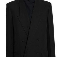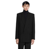 In the Fall Winter 2025 collection, classic tailoring codes are reinterpreted through sharp construction and subtle details. This double-breasted jacket features a peak lapel, covered buttons, and tonal GG lining. Flap pockets and a chest welt pocket complete the design. - Black technical panama - Fully lined with tonal GG - Double-breasted - Peak lapel - Covered buttons - Chest welt pocket - Two front flap pockets - Length: 31.9"; (size 48 IT) - Made in Italy