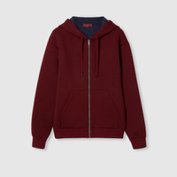 The Pre-Fall 2025 collection seamlessly blends soft textures with sophisticated detailing to define refined winter wardrobe pieces. Crafted from Gucci Rosso Ancora red double viscose jersey, this zip jacket features a subtle Gucci embroidery. - Gucci Rosso Ancora red double viscose jersey - Gucci embroidery - Fixed navy hood inside - Long sleeves - Front pockets - Front zip closure - Made in Italy