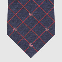 Emblematic motifs and symbols synonymous with the House combine to enrich silk accessories, continuing the Gucci narrative. Here, the unmistakable Double G motif appears alongside a delicate red check motif atop this dark blue silk tie as a vibrant jacquard detail. - Blue Double G and check silk jacquard - 2.75"W x 58.3"L - Made in Italy