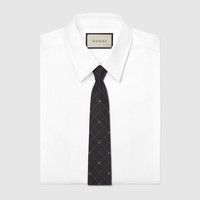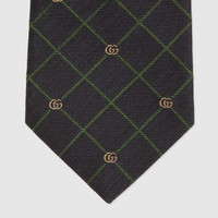 Emblematic motifs and symbols synonymous with the House combine to enrich silk accessories, continuing the Gucci narrative. Here, the unmistakable Double G motif appears alongside a delicate green check motif atop this dark blue silk tie as a vibrant jacquard detail. - Blue Double G and check silk jacquard - 2.75"W x 58.3"L - Made in Italy
