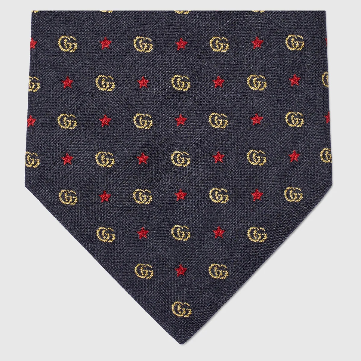The Gucci Aria collection is an ode to both the traditional and the contemporary nature of the House. Symbols that have defined different eras appear as recognizable logos combined with contrasting colors and patterns. Here, the Double G decorates this blue silk jacquard tie, while vivid red stars complete the style with a whimsical feel. - Blue silk jacquard with red stars and Double G motif - Gucci bee label on the back - 2.8"W x 58.3"L - Made in Italy