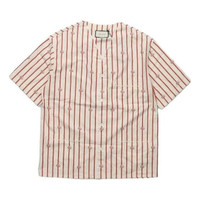 Sportswear meets leisurewear in a series of bowling shirts reimagined with a pajama-inspired attitude. This shirt is designed with an oversize, relaxed fix in ivory cotton with red Double G stripes. - Ivory and red Double G stripe cotton with contrast piping - Mother of pearl buttons - Collarless with V-neck - Front patch pockets - Short sleeves - Oversize fit - 100% cotton - Made in Italy - The product shown in this image is a size 48 (IT)