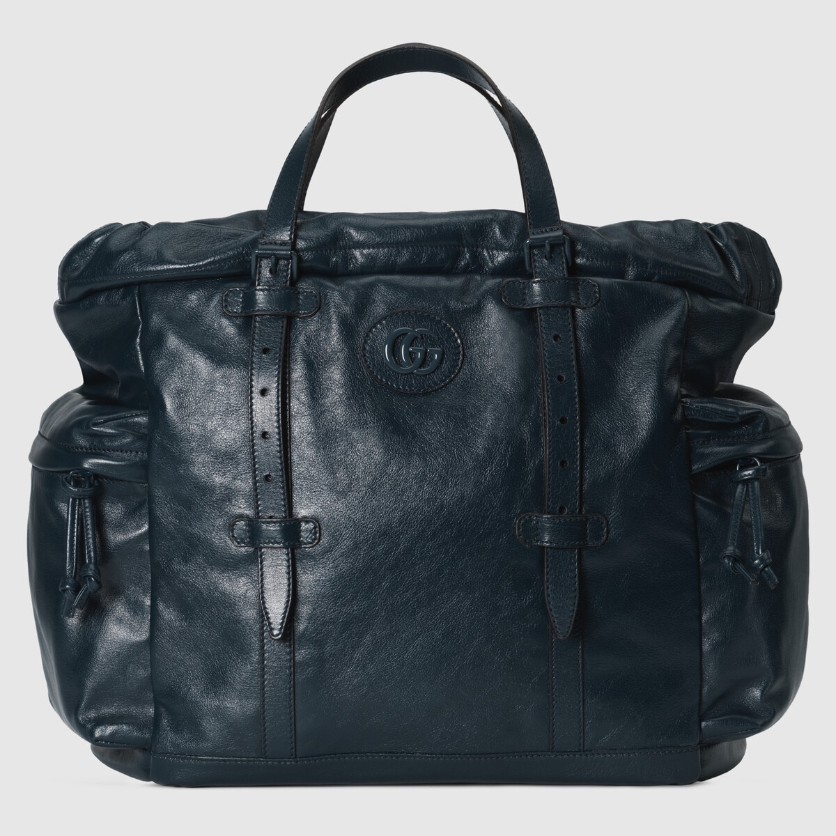Having appeared in previous collections atop small leather goods, tone-on-tone hardware now enriches the luggage line. The enamel detail offers a softer expression of the emblematic Double G, resulting in an understated travel accessory. Here it defines a dark blue leather tote bag with an elegant logo feel. - Dark blue leather - Dark blue enamel hardware - Original GG canvas lining - Double G - Inside: 2 zip pockets - Outside: 2 side zip pockets - Top handle with 3.9" drop - Adjustable front straps - Drawstring closure - Weight: 3.2lbs approximately - 15.7"W x 15"H x 7.5"D - Made in Italy