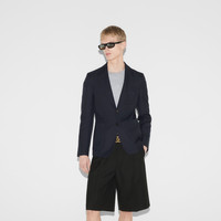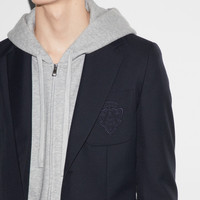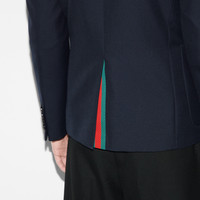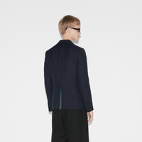 Transitioning into the warm season, new sets bring to mind a sartorial uniform enriched with subtle yet refined details, in cotton or jersey, in logo-detailed outerwear or knitwear. This structured jacket is presented in a dark blue military drill and enriched with a Gucci Liftboy embroidery. - Dark blue military drill - Gucci Liftboy embroidery - Fully lined - Fused construction - Single breasted - Notch lapels - Chest pocket - Two front pockets - Rear vent - Shoulder drop: 17.1" - Sleeves length: 18.3" - Button closure - Regular fit - Length: 27.3" - Made in Italy