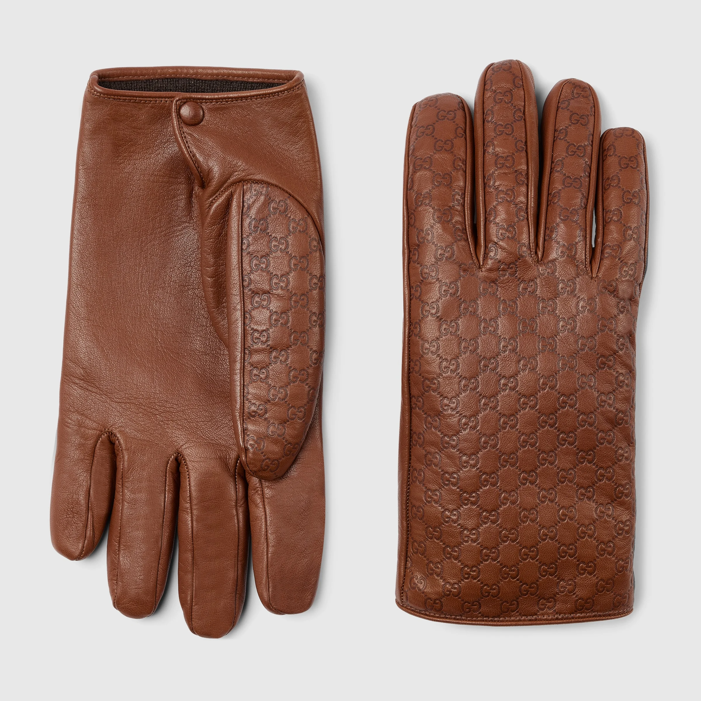 The Cruise 2026 men's soft accessories collection is a journey through legacy and modernity rooted in Gucci's archives. These ultra wearable gloves have been made from an embossed GG leather and black leather. - Brown embossed GG leather and black leather - Lined - Button closure