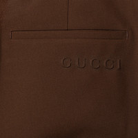 In the Spring Summer 2025 collection, sartorial pants are lent a casual feel through split sides and loop and button detailing. This pair of pants in refined wool twill feature multiple pockets and an embossed Gucci logo. - Dark brown wool twill - Belt loops - Two side pockets - Two back pockets - Embossed Gucci logo on the back - Splits on the sides with loop and button details - Length: 41" - Leg opening: 7.7" - Made in Italy