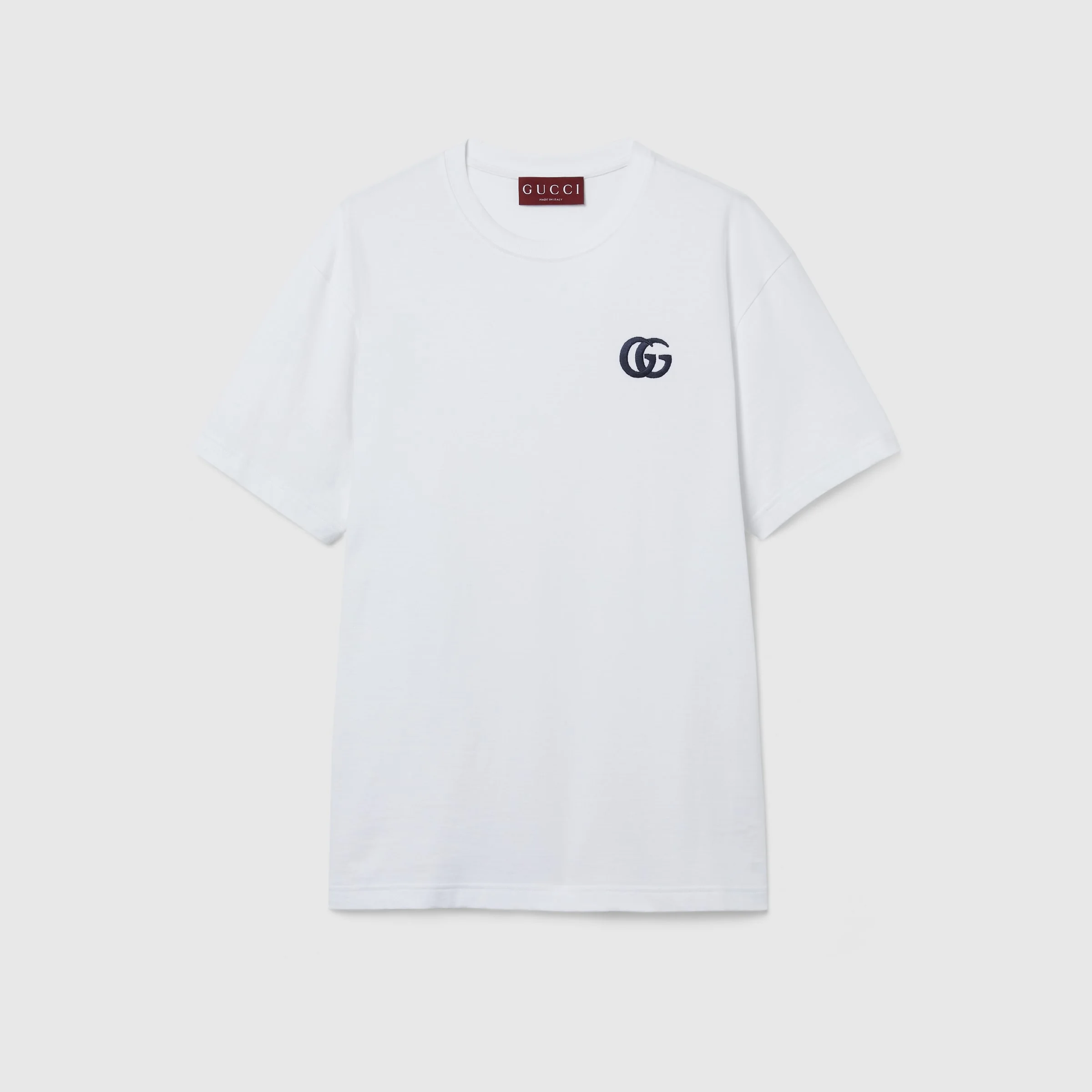 Transitioning into the next season, new sets bring to mind a sartorial uniform enriched with subtle yet refined details, in cotton or jersey, in logo-detailed outerwear or knitwear. This regular fit T-shirt is crafted from cotton jersey and features a Double G embroidery at the front. - White medium cotton jersey - Double G embroidery - Crewneck - Dropped shoulder - Short sleeves - Rib trim - Regular fit - Length: 28.9"; Shoulder: 19.7"; Chest: 22"; Sleeves length: 8.5"; based on a size M - Made in Italy - The model is 6' tall