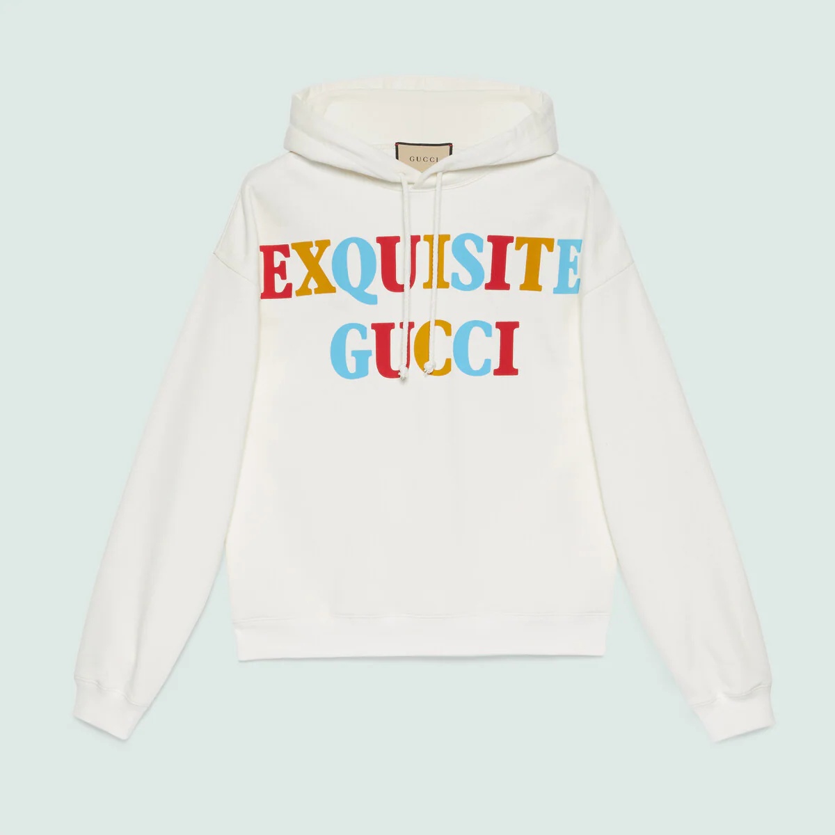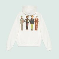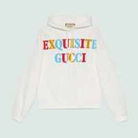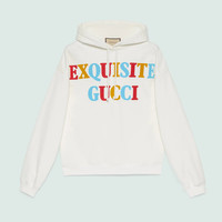 Displayed as colorful prints, the name of the collection, 'Exquisite Gucci' is printed on the front of this off-white hooded sweatshirt. The multicolored motif reflects the joyful narrative of the Maison, while the back characters add a playful touch to the piece. - Off-white cotton jersey - 'Exquisite Gucci' print on the front - Exquisite Gucci characters print at the back - Fixed hood with drawstring - Long sleeves - Rib trim - Washed effect - Made in Italy - The product in this image is shown in a size small