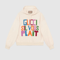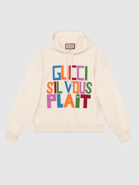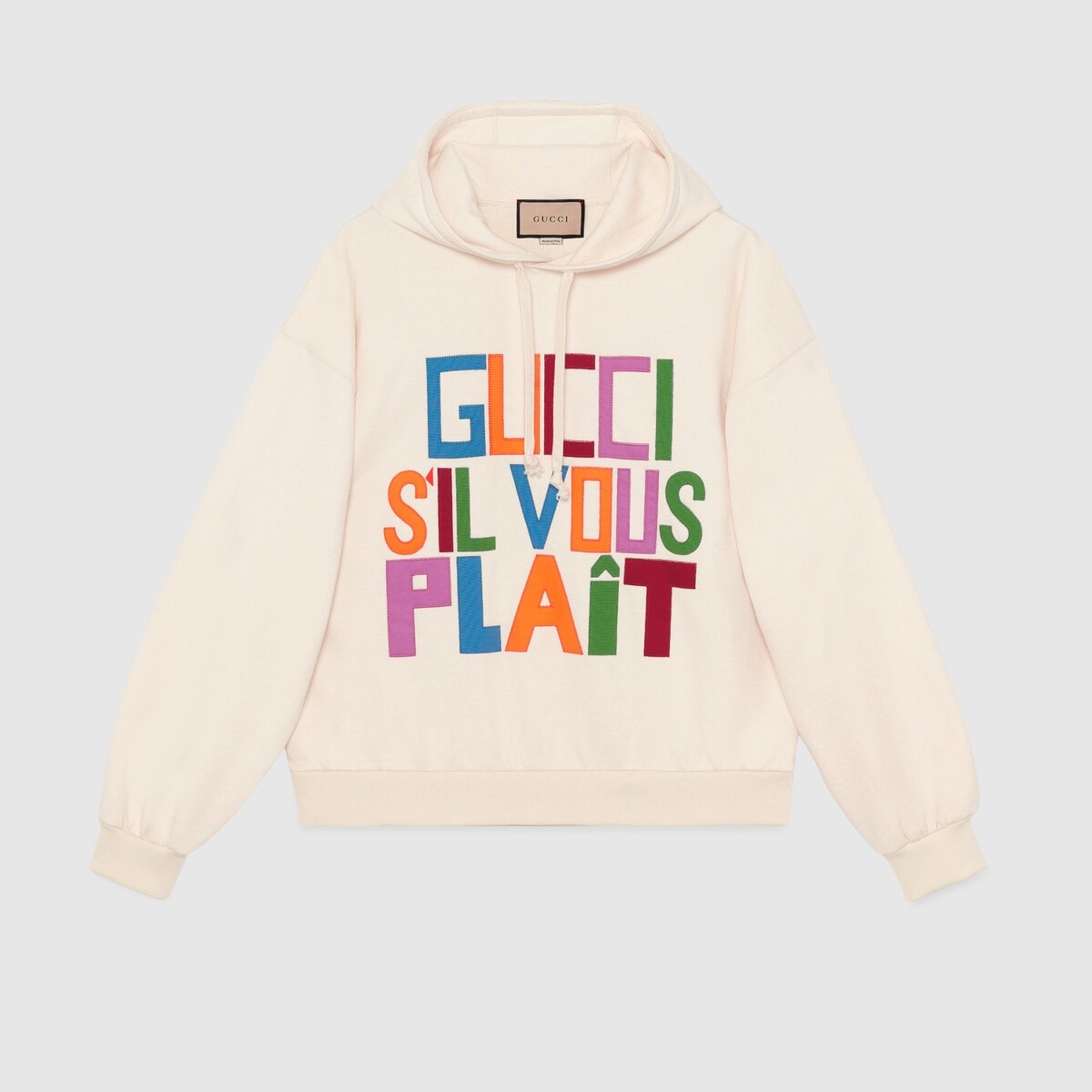 A key theme in the Gucci narrative, a humorous spirit permeates signature designs, adding a whimsical feel to the Pre-Fall 2023 collection. The House plays with tiny embroideries and vibrant prints in innovative ways, enriching a selection of menswear looks. A 'Gucci S'Il Vous Plaît' embroidered patch decorates this sweatshirt. - Ivory felted cotton jersey - 'Gucci S'Il Vous Plaît' embroidered patch - Fixed hood with drawstring - Rib trim - Made in Italy - The product shown in this image is a size small