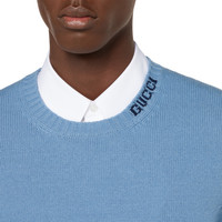The Pre-Fall 2025 collection spotlights essential silhouettes with emblematic details from daywear to eveningwear. This sweater is made from light blue felted wool knit and decorated with a Gucci intarsia. - Light blue felted wool knit - Gucci intarsia - Crewneck - Rib trim - Long sleeves - Made in Italy