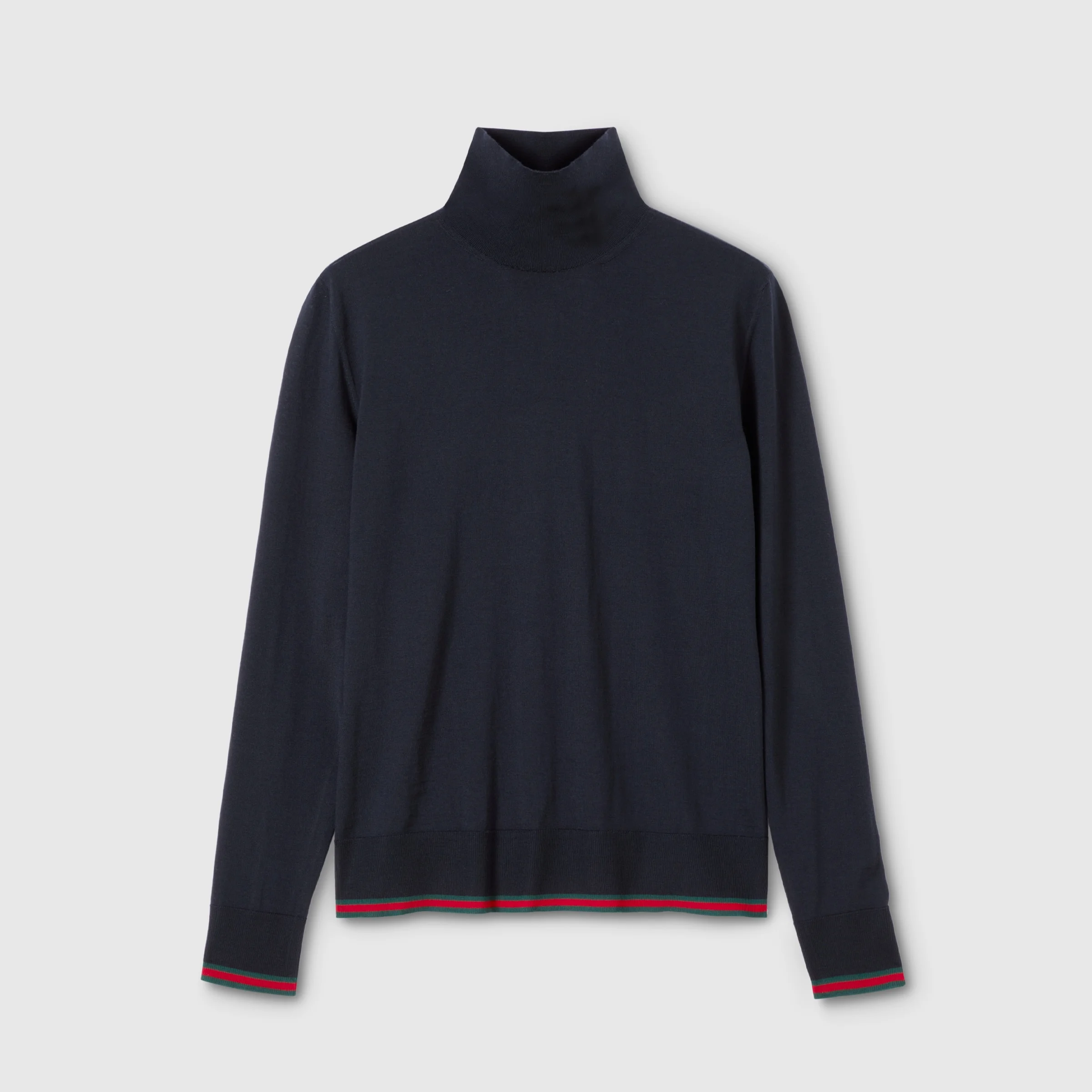 Silhouettes, fabrics, and craftsmanship draw from the House codes and speaks to the present without losing sight of the heritage. Crafted from fine knit wool, this turtleneck is defined by a Web trim. - Dark blue fine knit wool - Web trim - Turtleneck - Long sleeves - Length: 25.1" based on a size S