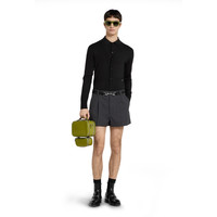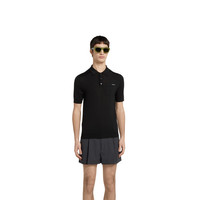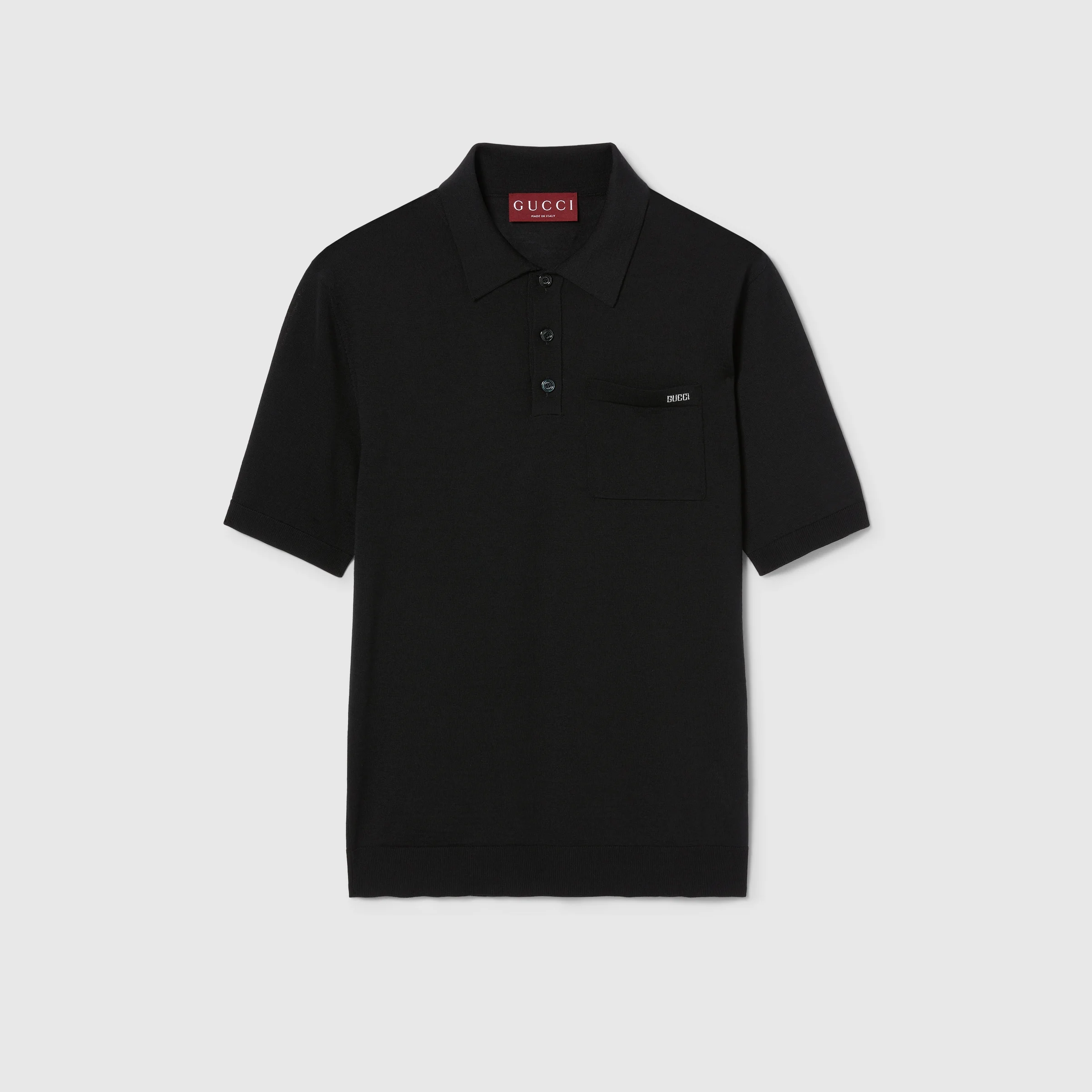 In the Spring Summer 2025 collection, intarsia details feature prominently. Here, this fine wool knit polo top features a delicate Gucci intarsia across the chest pocket. A polo collar and rib trim complete the design. - Black fine wool knit - Gucci intarsia - Polo collar - Short sleeves - Chest pocket - Rib trim - Half button closure - Length: 26.4", based on a size S - Made in Italy - The product shown in this image is a size small