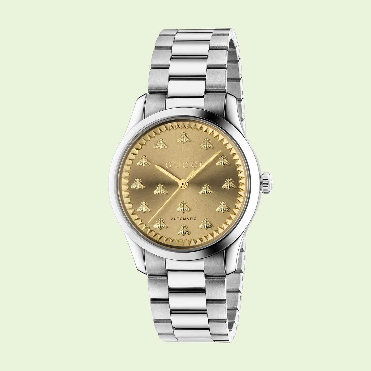 Part of the G-Timeless collection, this automatic watch is designed with a steel case and bracelet. The watch is characterized by a yellow gold sunbrushed dial and sapphire glass with an anti-reflective coating. At the center are bees, a signature symbol of the House. - 38mm steel case, yellow gold sunbrushed dial with bees, steel bracelet - Sapphire glass with antireflective coating - The warranty certificates for Gucci watches purchased after March 1st 2022 are exclusively available online. - Download your certificate at - by using the serial number engraved on the back of your watch. - 5 ATM (160 feet/50 meters) - Automatic movement - Wrist size from 5.2" to 7.7" - YA1264191 - Swiss Made