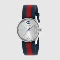 The G-Timeless line continues to define the latest collections, highlighting the signature motifs of the House. Presented with a blue and red nylon strap, the accessory features a stainless steel case and a silver-toned dial enriched with emblematic codes. - 38mm stainless steel case - Silver-toned dial with Interlocking G, Gucci logo, date at 3 o' clock - Sapphire glass with antireflective coating - Blue and red nylon strap - The warranty certificates for Gucci watches purchased after March 1st 2022 are exclusively available online. - Download your certificate at - by using the serial number engraved on the back of your watch. - Quartz movement - 5 ATM (164 feet/50 meters) - YA1264237 - Wrist size from 5.9" to 7.8" - Swiss Made