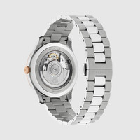 Generation Gucci delves into the brand's archival codes, and combines different generations of design into one aesthetic narrative. G-Timeless introduces a 40mm automatic style with a pink gold-plated bezel, bringing discreet luxury to everyday wear. - 40mm stainless steel case - Pink gold-plated bezel, black dial with Diamantissima pattern, Interlocking G and Gucci lettering - Sapphire glass with antireflective coating - Stainless steel bracelet - The warranty certificates for Gucci watches purchased after March 1st 2022 are exclusively available online. - Download your certificate at - by using the serial number engraved on the back of your watch. - Automatic movement - 5 ATM (50 meters/164 feet) - Power reserve: 42 hours - YA1263003 - Wrist size from 5.3" to 7.6" - Swiss Made