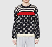 First used in the 1970s, the GG logo was an evolution of the original Gucci rhombi design from the 1930s, and from then it's been an established symbol of Gucci's heritage. Here it decorates a crewneck sweater and is paired with stripes. - Dark blue and white GG and stripes jacquard cotton - Red tape detail - Crewneck - 100% cotton - Made in Italy - The model is 6’1" and is wearing size medium