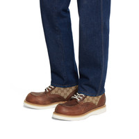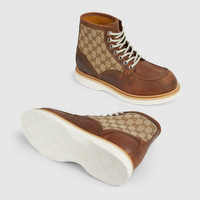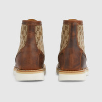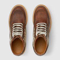 Merging classic design with signature House elements, this men's lace-up ankle boot features a GG canvas insert that nods to Gucci’s iconic heritage. Crafted with Goodyear construction for lasting durability and structure, the silhouette balances tradition and innovation. - Brown leather - GG canvas insert - Rubber sole - Goodyear construction - Lace-up closure - Height: .3" - Made in Italy
