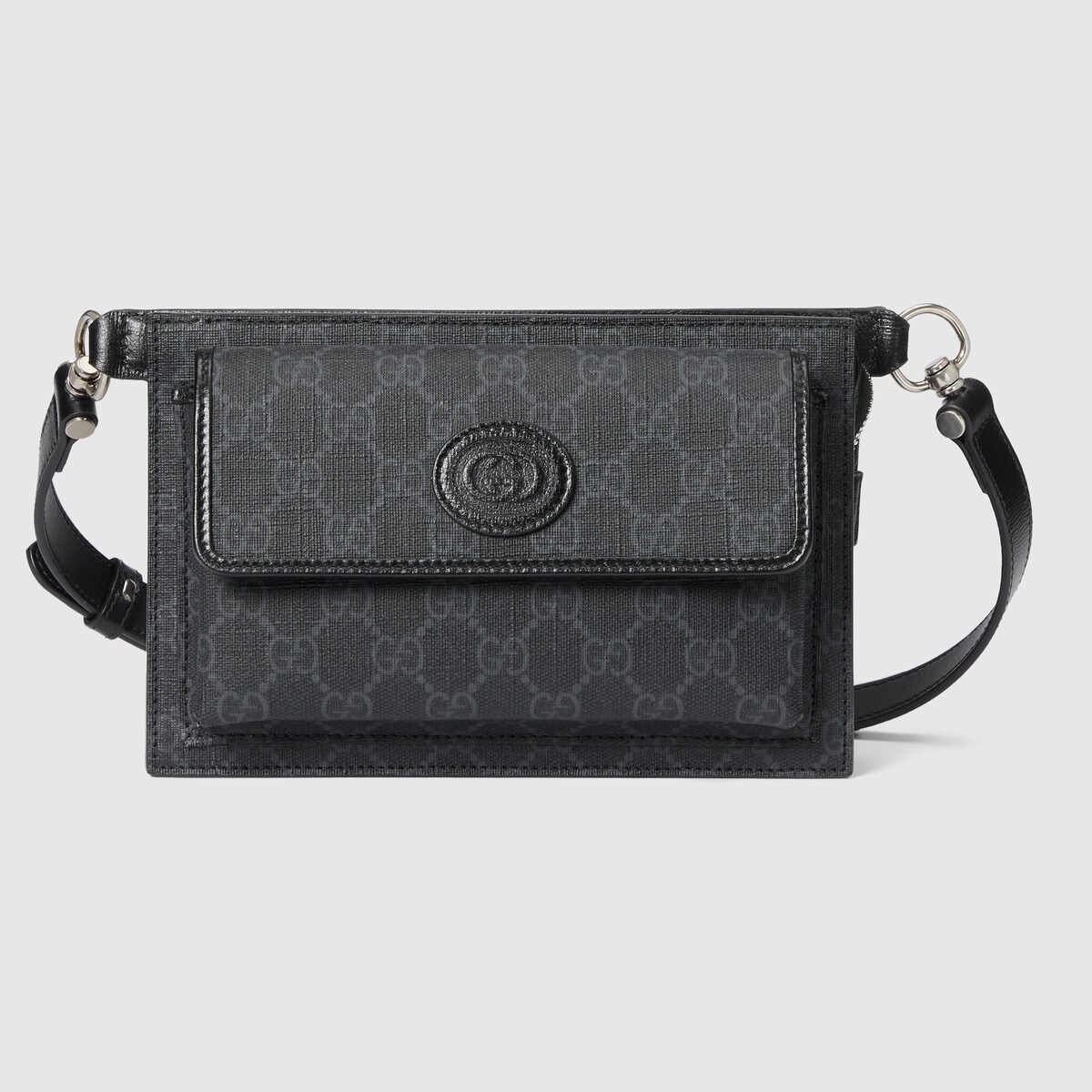 Gucci continues to explore its offering of leathergoods, referencing the House's origins in luxury travel from the 1920s. Small leather accessories, such as this belt bag in black GG Supreme sport subtle logo details and are easily matched with ready-to-wear pieces for a final look. - Black GG Supreme canvas - Black leather trim - Moiré and microfiber lining with suede-like finish - Oval Interlocking G leather tag - Front pocket with button - Open back pocket - Zip closure - 7.1"W x 5.1"H x 2"D - Made in Italy - Weight: 0.9lbs approximately