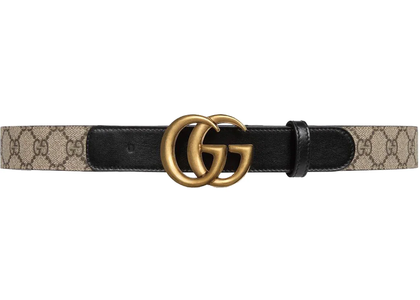 The House GG monogram in its emblematic beige/ebony color combination is matched with black leather in this belt introduced for Pre-Fall 2020. The Double G buckle with an aged finish completes the accessory. - Beige/ebony GG Supreme and black leather - Aged gold-toned hardware - This product contains leather made through an alternative chrome free tanning process, reducing the environmental footprint compared to traditional methods. - Double G buckle - Buckle: 3"W x 2.4"H - 1.5" belt width - Made in Italy - Can be worn as a hip or waist belt. Sizing will differ based on where the belt is worn, please refer to the size guide to find your size.