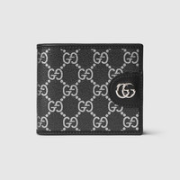 The Cruise 2026 collection reinterprets the House’s history of elegance and craftsmanship, introducing metallic styles which impart new light on the signature GG motif. This bi-fold wallet has been crafted from a laminated-effect GG Monogram coated fabric enriched with a Double G detail. - Black and silver laminated-effect GG Monogram coated fabric - Palladium-toned hardware - Black taffeta lining - Double G - Web detail - Inside: 8 card slots, 1 bill compartment and 2 internal flat pockets under card slots - Closed: 4.3"W x 3.5"H; Open: 8.2"W x 3.5"H - Weight: 0.2lb, approximately - Made in Italy