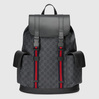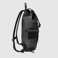 The GG motif in a distinct black/grey combination is further enriched with Web straps and black leather trims. Made in soft GG Supreme, a softer version of GG Supreme canvas, crafted from a coated microfibre fabric with the GG motif. - Black/grey soft GG Supreme, crafted from a coated microfibre fabric, with black leather trim - Blue and red Web - Interior nylon drawstring closure - Black mesh back - Side flap pockets with magnetic snap closure - Padded iPad compartment - Smartphone pockets - Adjustable padded straps with mesh backing - Flap closure with buckled straps - W34cm x H42cm x D16cm - Made in Italy