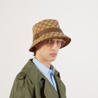 Crafted from monogram canvas, this bucket hat is completed by a tonal leather trim. Enhanced by the historic Double G detail on the side, both the archival references and the shape speak to the vintage feel that permeates the House's design narrative. - Beige/brown GG canvas - Brown leather trim - Cotton lining - Double G - Made in Italy