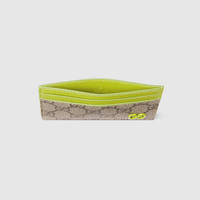 This bi-color card case is presented as part of the Pre-Fall 2025 collection. Crafted from GG Supreme, it reveals a contrasting leather trim and a ceramic-effect GG detail. - Beige and dark brown GG Supreme - Acid green leather trim - Brass hardware with acid green ceramic-effect finishing - GG detail - Four card slots, one open pocket - 4.3"W x 2.7"H - Made in Italy - Weight: 0.06lbs approximately