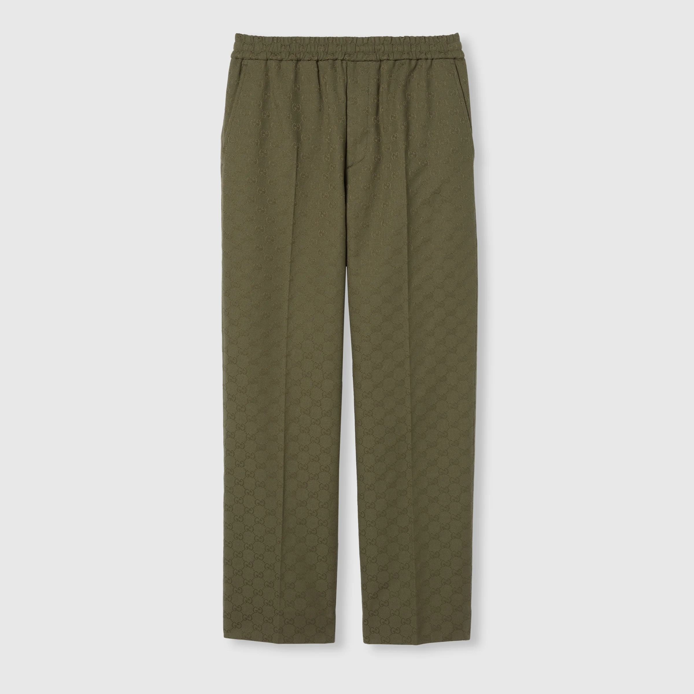 Pre-Fall 2025 pieces in muted black, grey and green tones spotlight delicate floral embroideries, embossed logos, and more craftsmanship details. Crafted from GG canvas, this pair of pants is finished a comfortable elastic waistband. - Forest green GG canvas - Elastic waistband with drawstring - Two side pockets - Two back pockets - Length: 40.9"; Waist: 16.5"; Hips: 22"; Hem width: 9.1"; based on a size 48 IT - Made in Italy - Fabric: 70% Cotton, 30% Polyester - Pocket lining: 100% Cotton