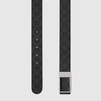 Men's belts with reversible rectangular buckle feature the House's signature motif on one side and leather on the other in neutral shades. Stated in a GG Supreme and smooth leather, it's defined by a rectangular buckle with Gucci engraving detail. - Black GG Supreme on one side and black leather on the other - Palladium-toned hardware - Rectangular buckle with Gucci engraving - Detachable buckle - 1.3" width - Made in Italy - Can be worn as a hip or waist belt. Sizing will differ based on where the belt is worn, please refer to the size guide to find your size.