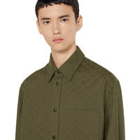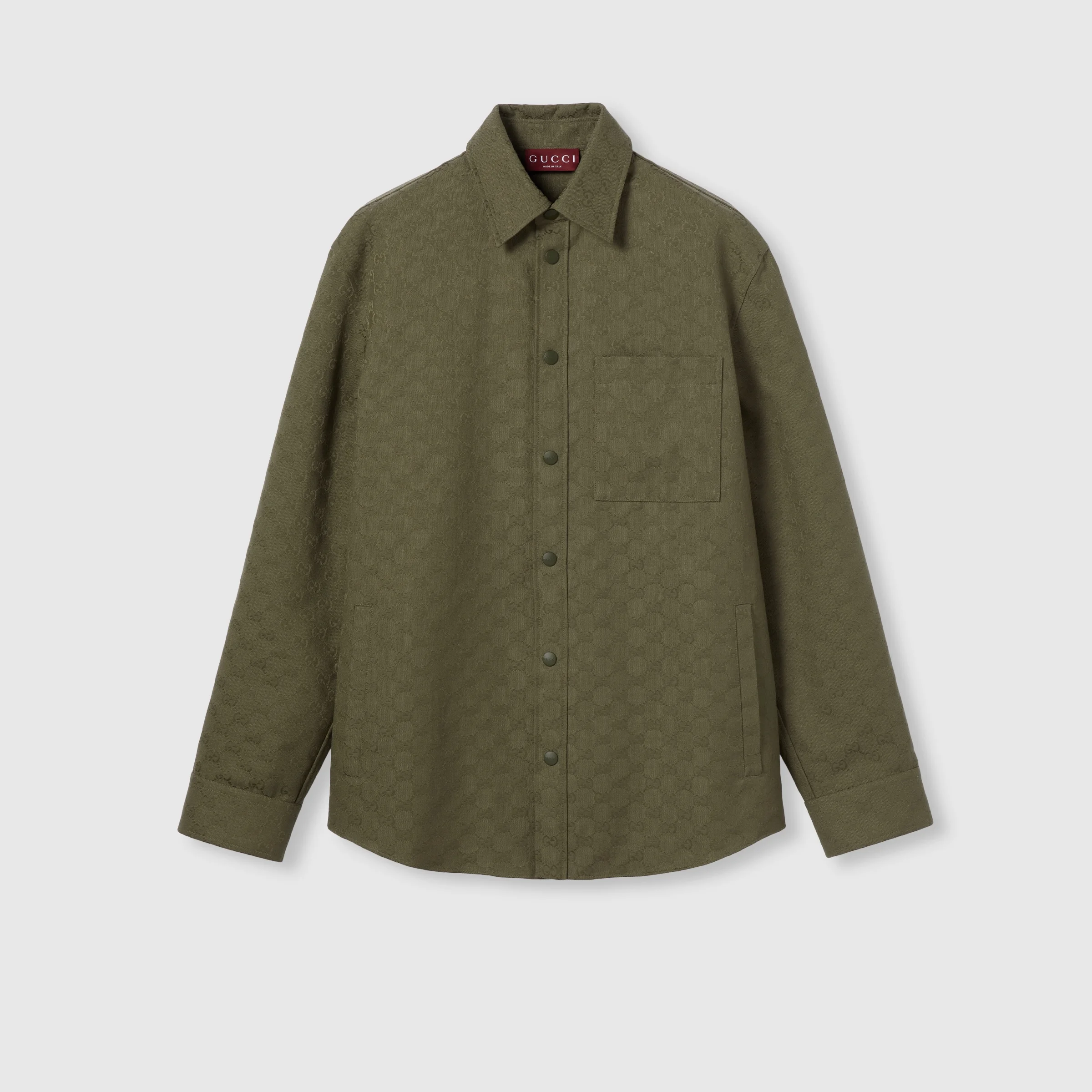Pre-Fall 2025 pieces in muted black, grey and green tones spotlight delicate floral embroideries, embossed logos, and more craftsmanship details. Crafted from forest green canvas, this shirt is defined by the signature GG monogram. - Forest green GG canvas - Point collar - Long sleeves - Front patch pocket - Neck width: 17.3"; based on a size 50 (IT) - Shoulder drop: 20.4"; based on a size 50 (IT) - Chest: 50.7"; based on a size 50 (IT) - Sleeves length: 50.7"; based on a size 50 (IT) - Snap button closure - Oversize fit - Length: 32.6"; based on a size 50 (IT) - Made in Italy