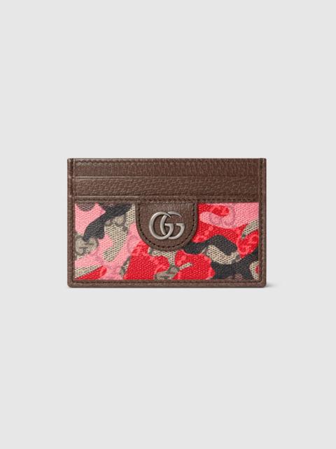 Vibrant camouflage in distinctive colors reinterprets the emblematic GG motif. Crafted from a marbled GG Monogram coated fabric, this card case features a Double G detail. - Pink and red camouflage marbled GG Monogram coated fabric - Brown leather trim - Palladium-toned hardware - Brown taffeta lining - Double G - Web detail - Inside: 1 open compartment - Outside: 4 card slots - 4.3"W x 2.7"H - Weight: 11.8", approximately - Made in Italy