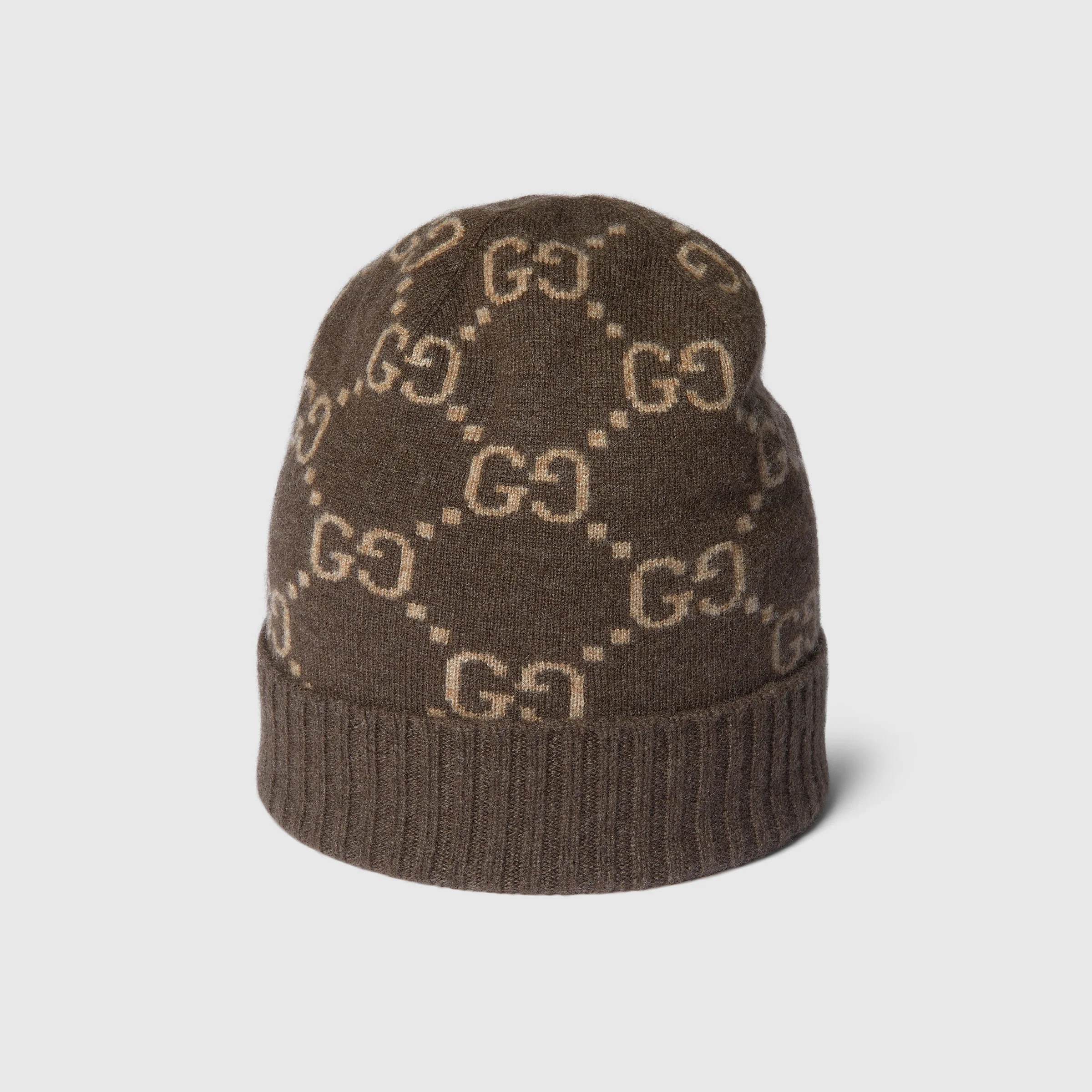 A signature symbol of the House, the GG monogram is displayed atop a selection of silk and soft accessories in a delicate color palette. This versatile hat has been crafted from a GG cashmere jacquard and completed with a rib knit trim. - Brown and beige GG cashmere jacquard - Rib knit trim - Made in Italy