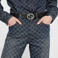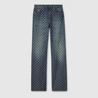Introducing Spring Summer 2026. This style is part of the La Famiglia collection, which reinterprets the House’s codes through singular personalities and distinctive aesthetic attitudes. This denim pants are presented in washed certified GG cotton denim jacquard. - Blue washed certified GG cotton denim jacquard - Embossed Gucci made in Italy leather label - Belt loops - Five-pocket style - Button and zip fly closure - Flare fit - Length: 47"; Leg opening: 10.6", based on a size 30 - Made in Italy - Label: Calfskin - Fabric: 100% Cotton - Pocket lining: 65% Polyester, 35% Cotton