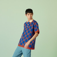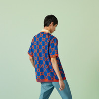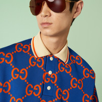 Season after season, the House develops new designs, always drawing attention to the heritage of craftsmanship. Further exploring daywear possibilities, an interaction between vibrant textures and cooler fabrics makes a statement across a selection of Pre-Fall ready-to-wear pieces. This polo T-shirt appears in blue and orange GG cotton jacquard. - Blue and orange GG cotton jersey jacquard - Polo collar - Button-through placket - Short sleeves - Striped rib trim - Back length: 29,1"; based on size M - Over fit - The model is 6'1" and is wearing size medium - Shoulder width: 18,8"; based on a size M