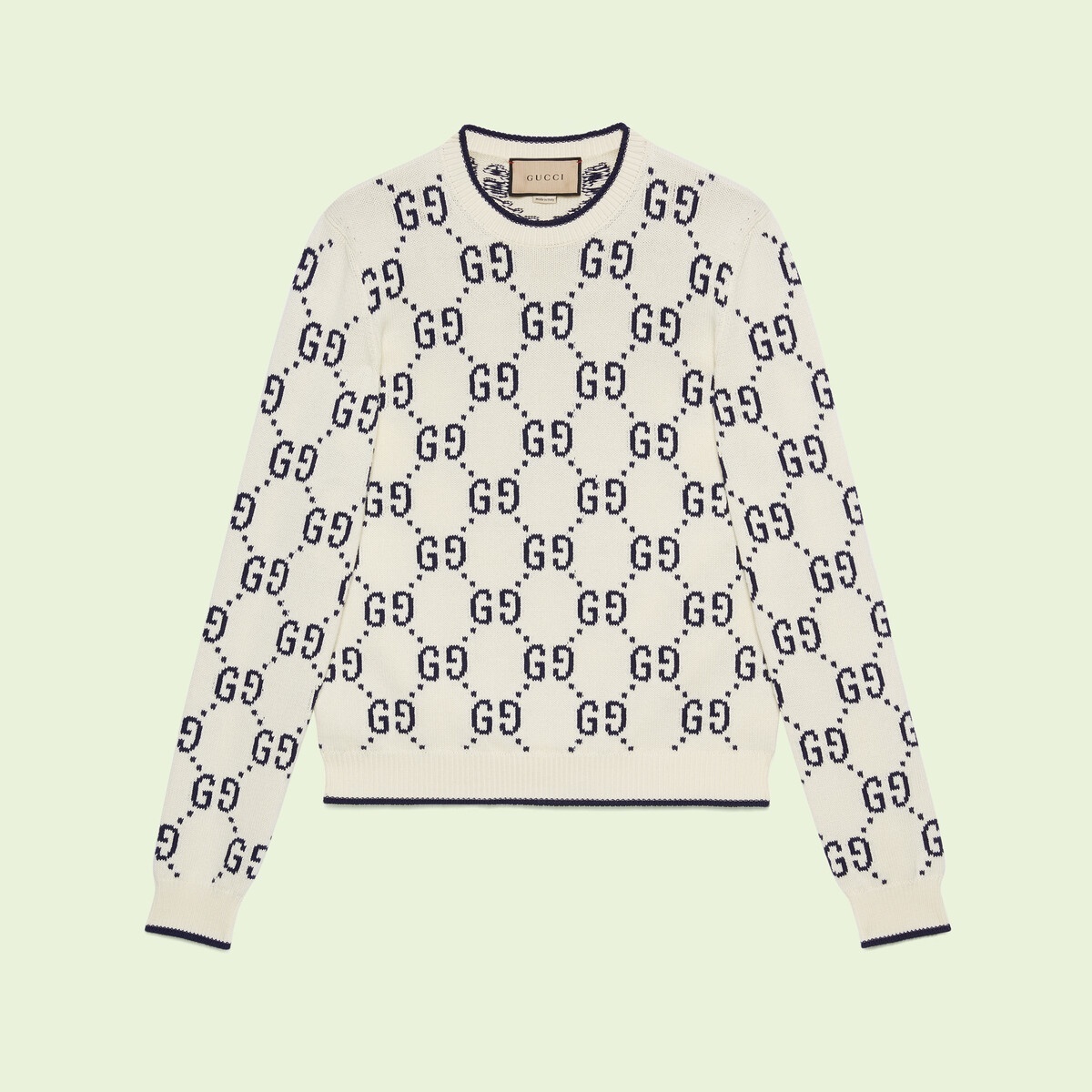 Codes that have become synonymous with the House remain a source of inspiration for the Creative Director. Originally created in the 1930s as an homage to Founder Guccio Gucci, the distinctive GG motif defines this crewneck knit in contrasting colors. - Ivory cotton with blue GG intarsia - Crewneck - Rib trim - Length: 23.6", based on a size S - Made in Italy - The model is 6" tall. The product shown in this image is a size small