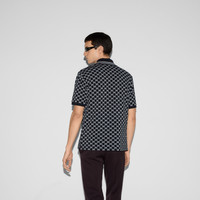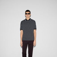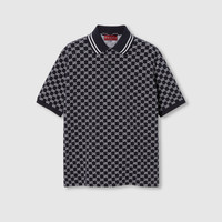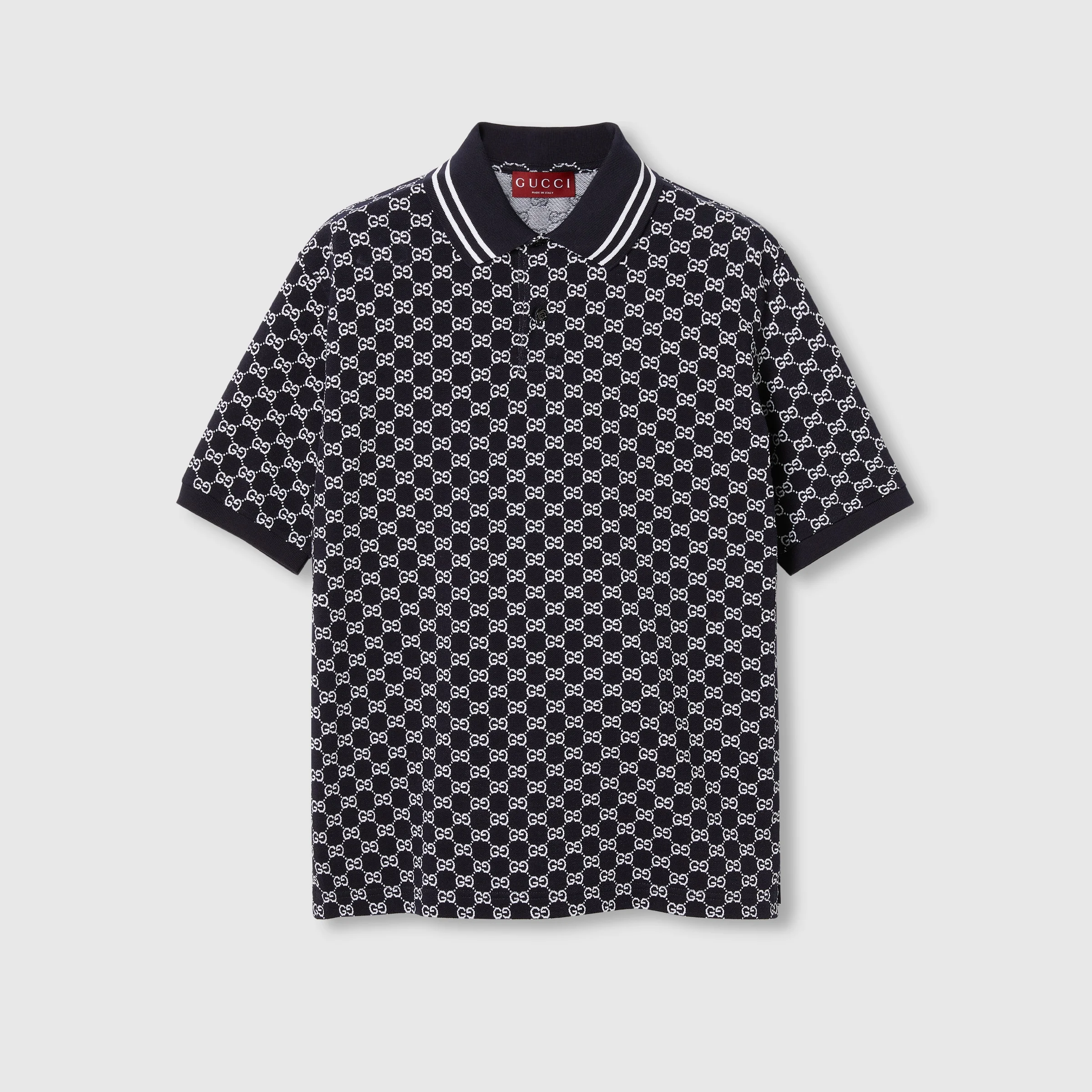 Classics such as soft knitwear and polo shirts throughout the Cruise 2025 collection stand out with subtle details that elevate everyday looks. This regular fit polo shirt is presented in a GG cotton piquet jacquard and comes complete with a striped polo collar. - Navy and white GG cotton piquet jacquard - Striped polo collar - Short sleeves - Button closure - Regular fit - Length: 28.7"; Shoulder: 18.7"; Chest: 22.4"; Sleeves length: 9.4"; based on a size M - Made in Italy - The model is 6'2" and is wearing size small