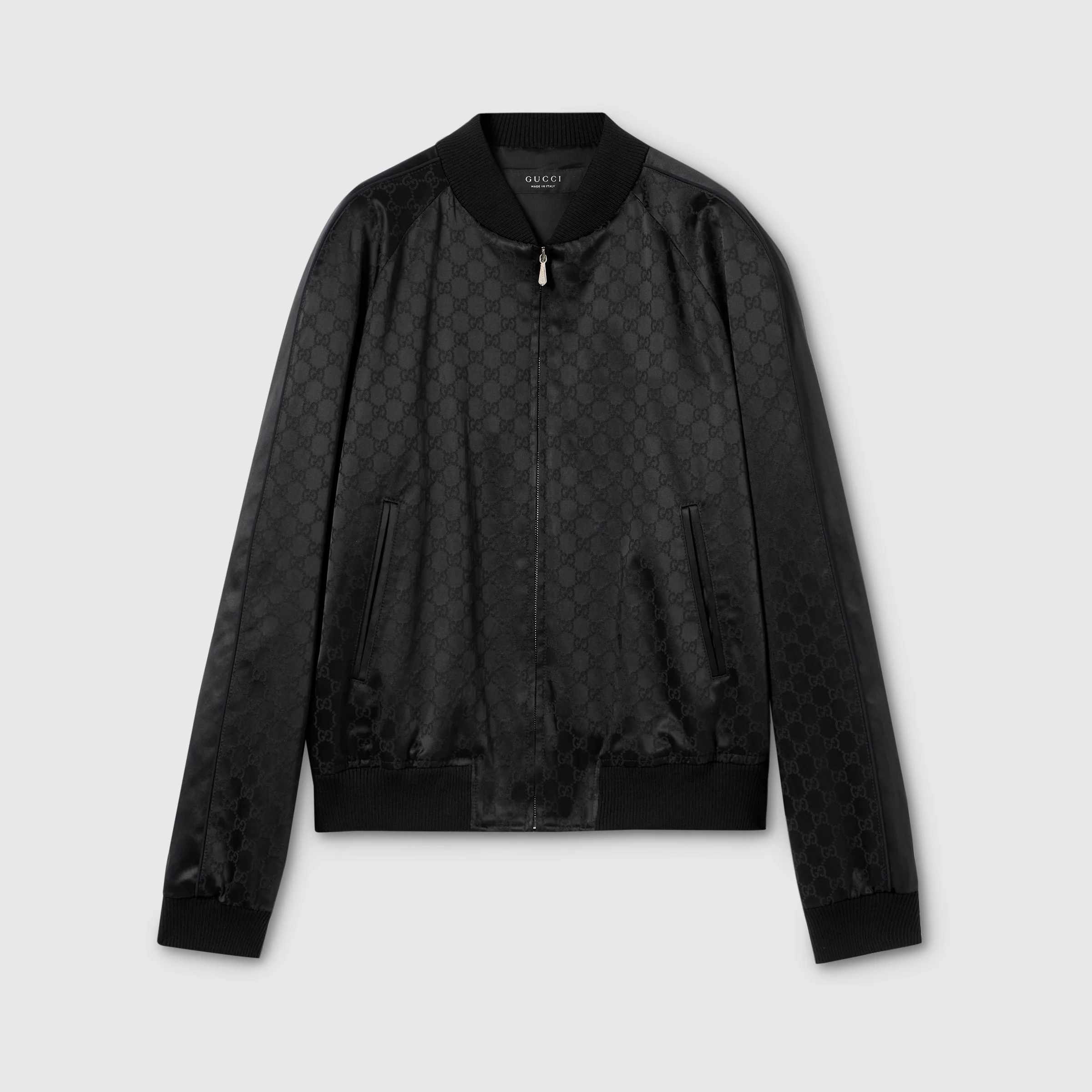 Introducing Spring Summer 2026. This style is inspired by the "Principino" look of La Famiglia. The collection reinterprets the House’s codes through singular personalities and distinctive aesthetic attitudes. Crafted from GG cotton satin, this zip jacket is enriched with a piping detail along the sides. - Black GG cotton satin - Knit rib trim - Engraved Gucci zip puller - Piping detail - Lined - Side pockets - Long sleeves - Front zip closure - Length: 24.8", based on a size 44(IT) - Made in Italy - Fabric: 52% Cotton, 45% Acetate, 3% Elastane - Details: 52% Cotton, 45% Acetate, 3% Elastane - Parts in knitted fabric: 96% Wool, 4% Elastane - Lining: 100% Viscose - Pocket lining: 100% Cotton