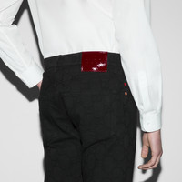 Black ushers in Pre-Fall mood with sophisticated sets that reveal complex internal constructions and subtle details behind a seemingly somber surface. These tapered pants are made from a GG denim jacquard, paying homage to founder Guccio Gucci's monogram motif. A Gucci Rosso Ancora naplak label adds a bold pop of color to the silhouette. - Black GG denim jacquard - Gucci Rosso Ancora naplak label - Five pocket construction - Waist: 16.9"; based on a size 32 (IT) - Hips: 19.4"; based on a size 32 (IT) - Hem width: 6.8"; based on a size 32 (IT) - Button and zip closure - Tapered fit - Length: 41.3"; based on a size 32 (IT) - Leg opening: 7"; based on a size 32 (IT) - Made in Italy - The product shown in this image is a size 32 (IT)