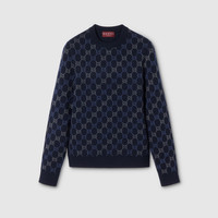 The distinctive GG is translated across different textile techniques in the collection, offering visual richness. This crewneck sweater is crafted from GG double wool knit. - Dark blue GG double wool knit - Crewneck - Rib trim - Long sleeves - Length: 25.5" based on a size S