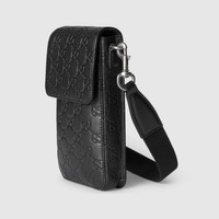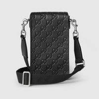 GG Emblem reinterprets the House's history of elegance and craftsmanship, in smooth leather embossed with the GG motif. Part of the latest line of small accessories, this case for iPhone is presented in embossed GG leather. - Black embossed GG smooth leather - Black cotton linen lining - Adjustable canvas shoulder strap with 21.6" drop - Flap with hidden magnetic snap closure - 4.7"W x 7.6"H x 1.5"D - Weight: 0.5lb, approximately - Compatible with iPhone