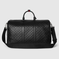 GG Emblem reinterprets the House's history of elegance and craftsmanship, in smooth leather embossed with the GG motif. This duffle bag features a Web detail on the snap button closure that keeps the double handles together. - Black embossed GG smooth leather - Black leather trim - Black cotton linen lining - Web detail with snap button closure - Inside: 1 zip pocket - Outside: detachable Liftboy ID tag, key holder - Handle drop: 4.7" - Detachable and adjustable canvas strap with 49.2" - 54.3" drop - Zip closure - 20.4"W x 12.9"H x 10.6"D - Weight: 5.9lbs, approximately