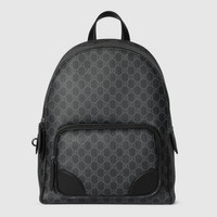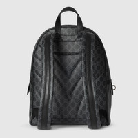 The new GG Emblem collection for men's travel reinterprets the House’s history of elegance and craftsmanship. This backpack is crafted from the new black GG Monogram coated fabric and features versatile inside pockets and an outside D-ring to attach accessories. - Black new GG Monogram coated fabric - Black leather trim - Cotton lining - Padded back - Inside: 1 padded laptop compartment, 1 pen holder and 1 zip pocket - Outside: 1 front zip pocket and 1 D-ring - Zip closure - Medium: 12.2"W x 16.1"H x 7.1"D - Weight: 3.2lbs approximately - Made in Italy