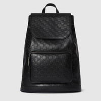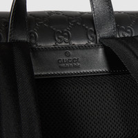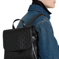 GG Emblem reinterprets the House's history of elegance and craftsmanship, in smooth leather embossed with the GG motif. The collection includes this versatile backpack, complete with a padded laptop compartment and padded mesh back. A Web loop detail further enriches the silhouette. - Black embossed GG smooth leather - Black leather trim - Embossed Gucci logo - Black cotton linen lining - Padded mesh back - Adjustable shoulder straps - Web loop detail - Inside: 1 zip pocket - Outside: 1 zip pocket - Handle drop: 3.9" - Flap closure with drawstring - 13.3"W x 17.3"H x 5.9"D - Weight: 3lbs, approximately - Fits a laptop, iPad, A4 notebook, iPhone Plus & other small items