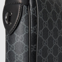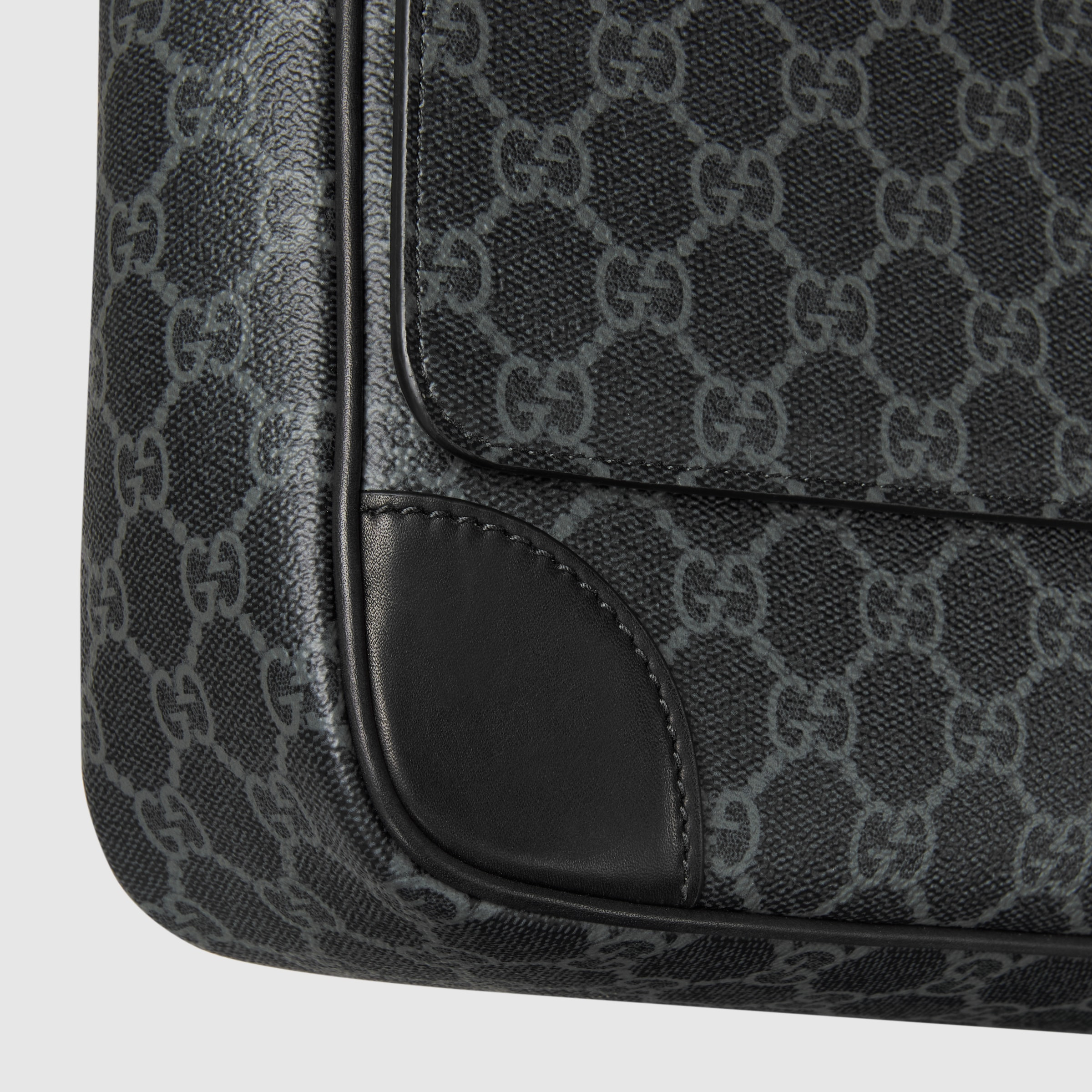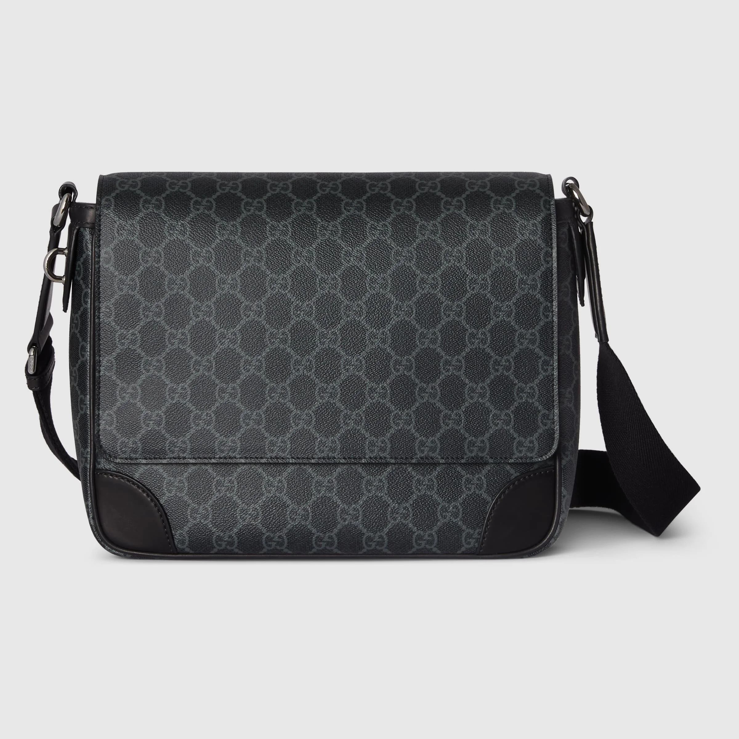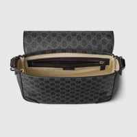 The new GG Emblem collection for men's travel reinterprets the House’s history of elegance and craftsmanship. This crossbody bag is crafted from the new black GG Monogram coated fabric and features an inside zip pocket and adjustable shoulder strap. - Black new GG Monogram coated fabric - Black leather trim - Cotton lining - Inside: 1 zip pocket - Adjustable canvas shoulder strap with 22.4" drop; Length: 31.5" - 53.5" - Flap closure - Medium: 11.4"W x 9"H x 3"D - Weight: 1.87lbs approximately - Made in Italy