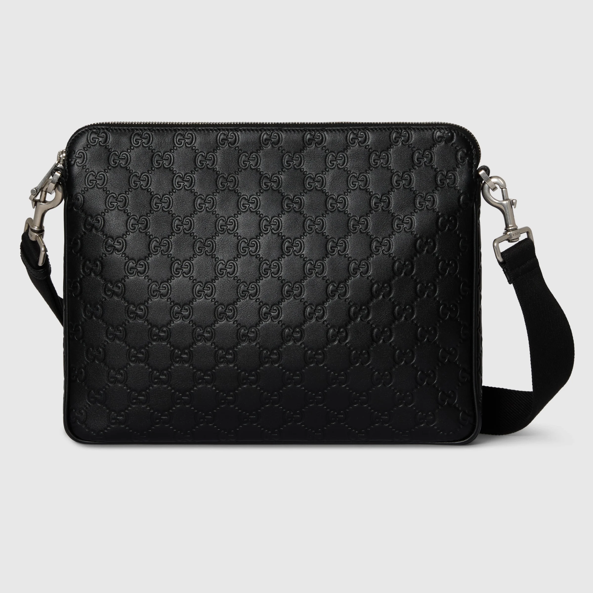 GG Emblem reinterprets the House's history of elegance and craftsmanship, in smooth leather embossed with the GG motif. This crossbody bag features a detachable, adjustable shoulder strap which makes it a multifunctional piece. - Black embossed GG smooth leather - Black leather trim - Black cotton linen lining - Web detail - Inside: 1 zip pocket - Detachable leather wrist strap with 7.8" drop - Detachable and adjustable canvas shoulder strap with 45.2" - 52.7" drop - Zip closure - 12.2"W x 9.6"H x 1.3"D - Weight: 1.3lbs, approximately - Fits iPad, A4 notebook, and small items