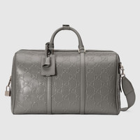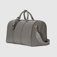 GG leather combines softness with the embossed allover House emblem, playing on texture and resulting in a slightly shiny finish. Here this duffle bag appears in a contemporary grey variation of the material, complete with top handle and shoulder strap. - Grey GG embossed leather - Cotton linen lining - Key and lock with detachable key holder - Detachable identification tag, key holder and lock - Gucci engraved metal feet - Inside: 2 zip pockets - 28L capacity - Top handle with 3.9" drop - Shoulder strap with 19.7" drop - Zip closure - Weight: 5.9lbs approximately - 17.7"W x 11.4"H x 9.8"D - Weight: 4.6lbs - Made in Italy