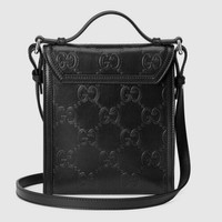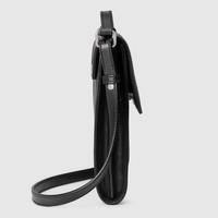 A new messenger shape with an adjustable shoulder strap and additional top handle is equipped with an organized interior including multiple compartments and card slots. Crafted from black GG leather, noted for its softness and slightly shiny finish. Introduced within the Pre-Fall 2020 collection, the leather plays with texture, embossing the House emblem onto a perforated base. - Black GG embossed leather - Cotton linen lining - Interior: 2 compartments with a center zipper pocket and 4 card slots - This item can fit a cell phone up to 3.1”W x 6.6”H x .4”D - Top handle with 2.4" drop; adjustable and detachable shoulder strap with 21.7" drop - Magnetic snap flap closure - 7.1"W x 8.1"H x 1.6"D - Weight: 1lb - Made in Italy