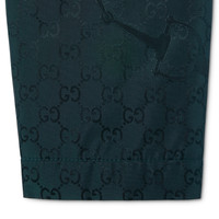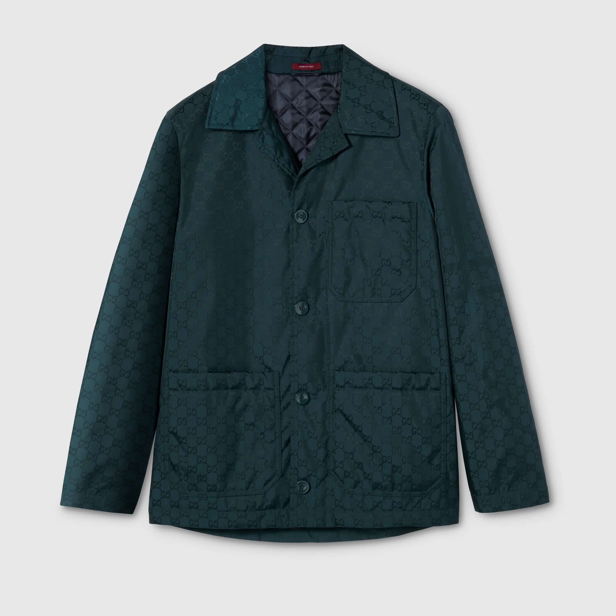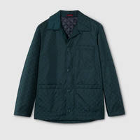 Equestrain symbols embellish signature silhouettes with a vibrant touch. This jacket is crafted from GG Horsebit technical fabric jacquard. - Dark blue GG Horsebit technical fabric jacquard - Quilted lining - Point collar - Chest pocket - Front pockets - Long sleeves - Front button closure - Length: 30.7" based on a size 48 (IT) - Fabric: 100% Polyamide - Lining: 100% Viscose - Padding (fiber): 100% Polyester
