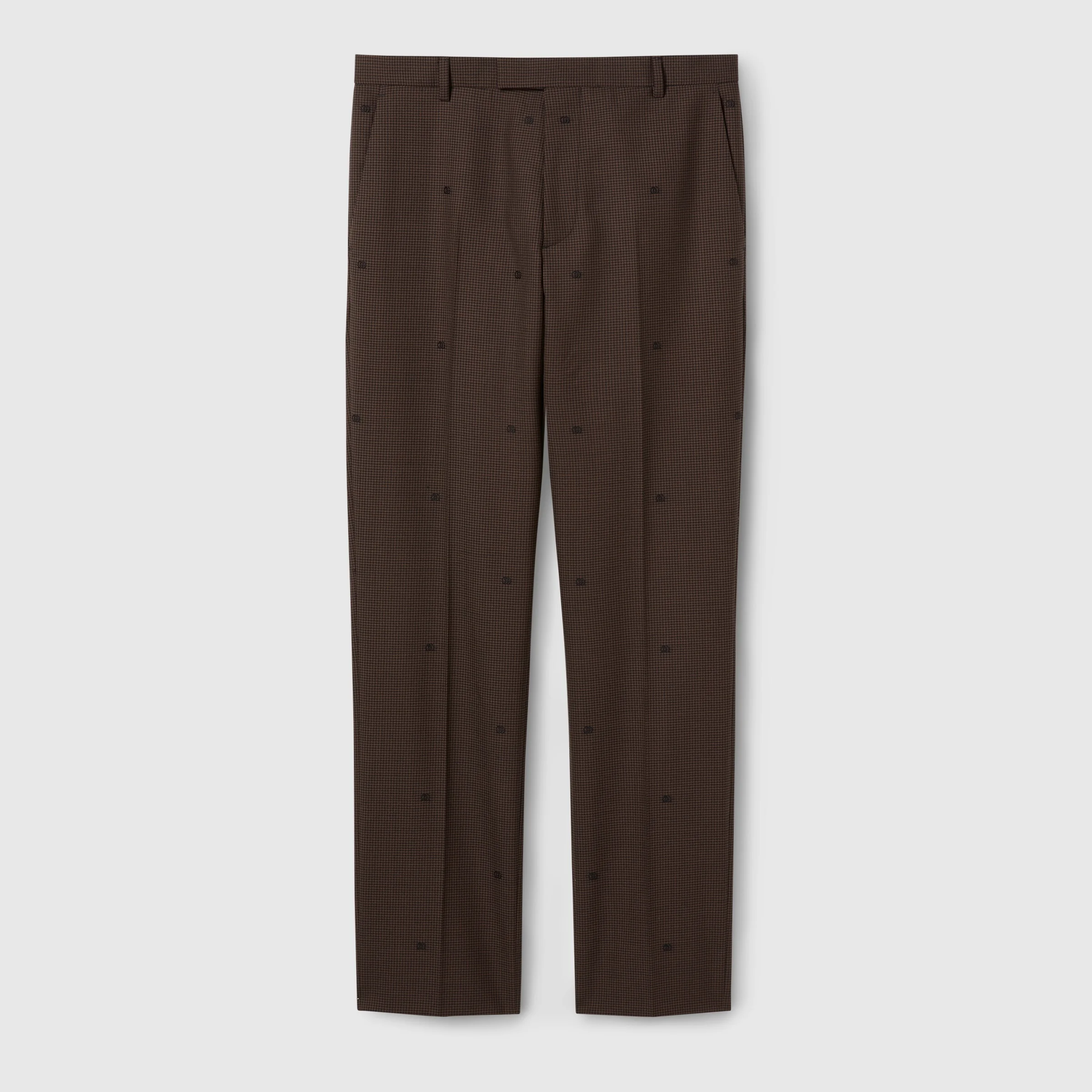 The Cruise 2026 men's formalwear introduces fashion-forward fits in seasonal shades. This pair of pants is tailored from brown and black GG houndstooth wool jacquard, offering a modern take on classic suiting. - Brown and black GG houndstooth wool jacquard - Belt loops - Two side pockets - Two back pockets - Tab and zip fly closure - Length: 40.9"; Waist: 16.7"; Hips: 19.7"; Hem width: 8"; based on a size 48 IT - Made in Italy