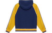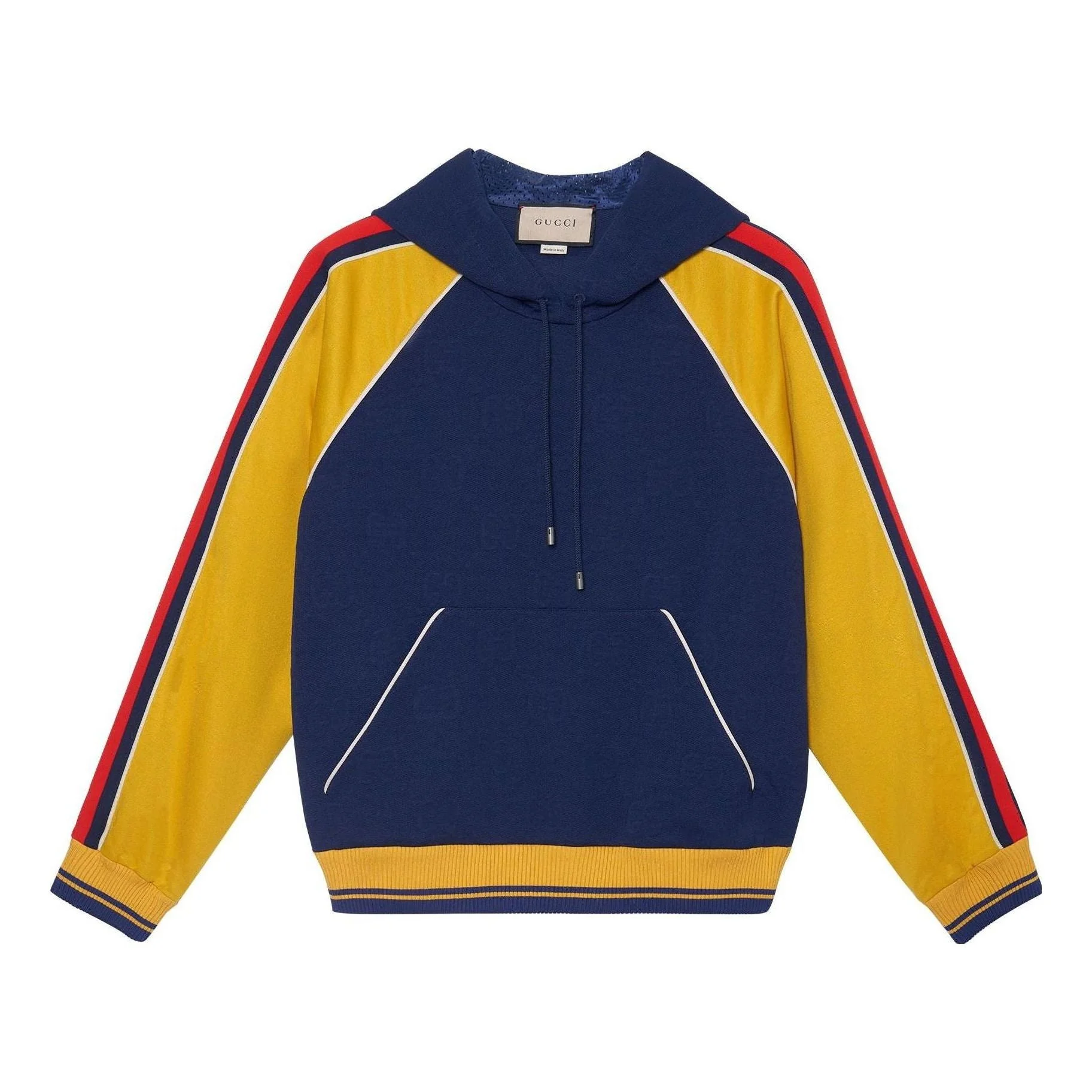 Instantly recognizable emblems of the brand, logos enrich designs in new and unexpected ways. Following the idea of constant change and experimentation, different iterations of the logo have been presented each collection. Here, the subtle GG jacquard pattern is contrasted by stripe detail down the arms with contrast details. - Blue GG jacquard polyester jersey with yellow polyester jersey - White trim - Blue and red Web stripes down the sleeves - Single front pocket - Hooded with drawstring - Made in Italy - The model is 6' 1" tall. The product shown in this image is a size small